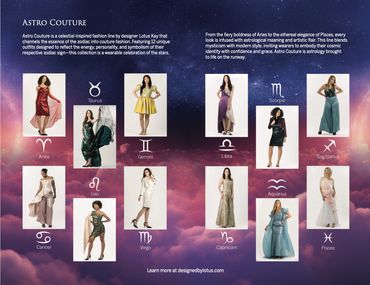 Astro Couture is a celestial-inspired fashion line by designer Lotus Kay that channels the essence of the zodiac into couture fashion. Featuring 12 unique outfits designed to reflect the energy, personality, and symbolism of their respective zodiac sign—this collection is a wearable celebration of the stars. From the fiery boldness of Aries to the ethereal elegance of Pisces, every look is infused with astrological meaning and artistic flair. This line blends mysticism with modern style, inviting wearers to embody their cosmic identity with confidence and grace. Astro Couture is astrology brought to life on the runway.